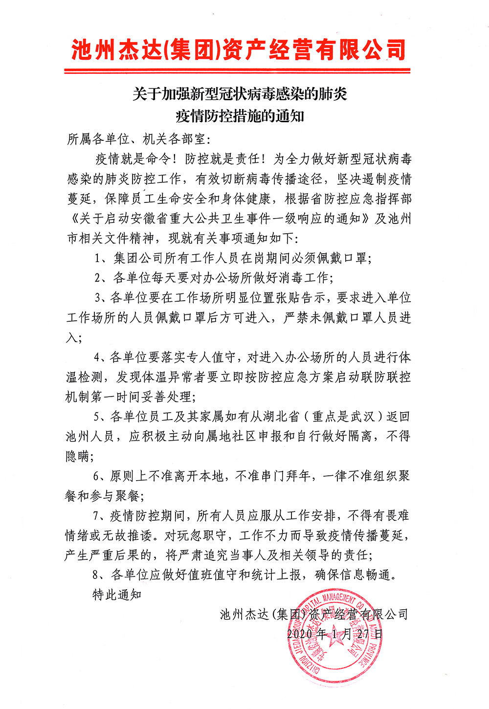 >> 通知公告 >> 杰達集團公司關于加強新型冠狀病毒感染的肺炎疫情防控措施的通知