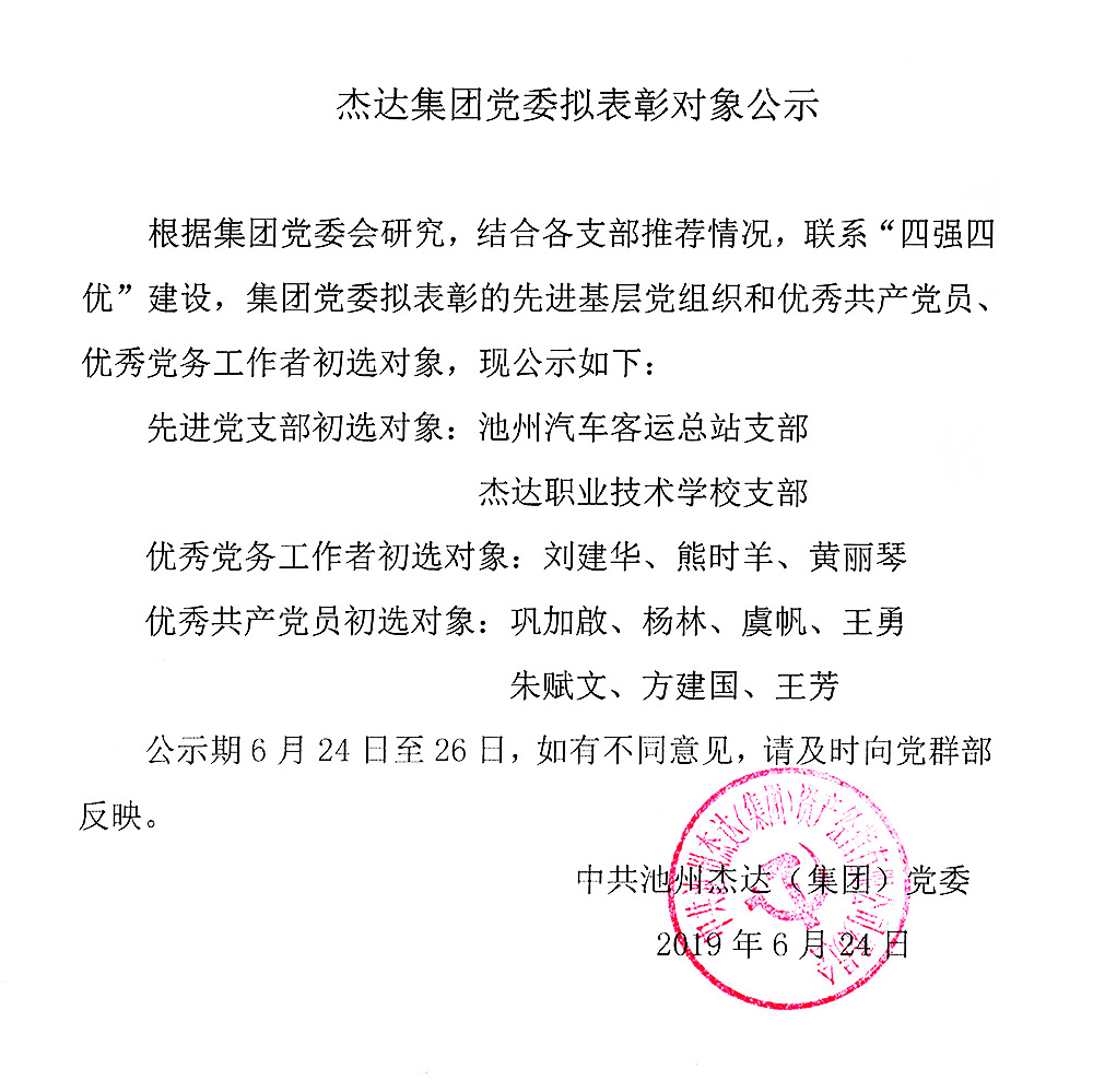 杰達集團黨委擬表彰對象公示