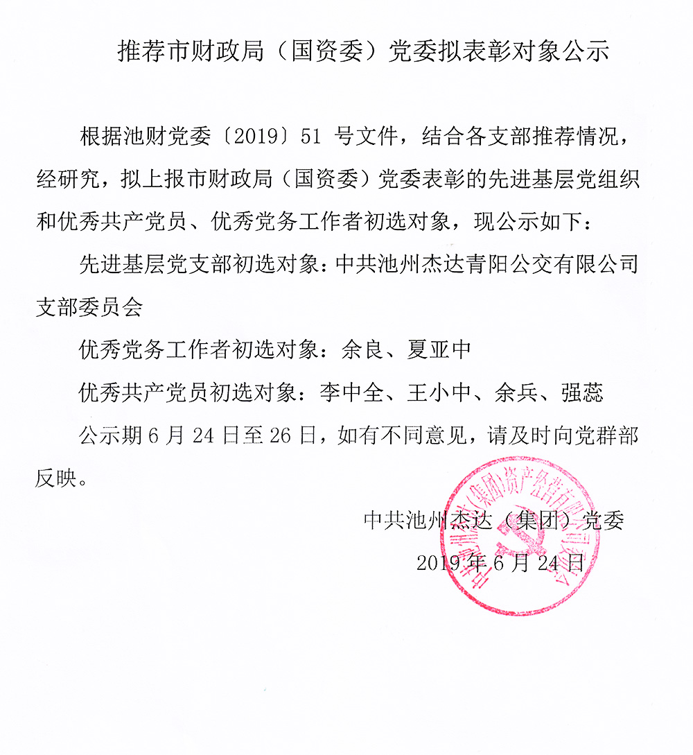 推薦市財政局(國資委)黨委擬表彰對象公示