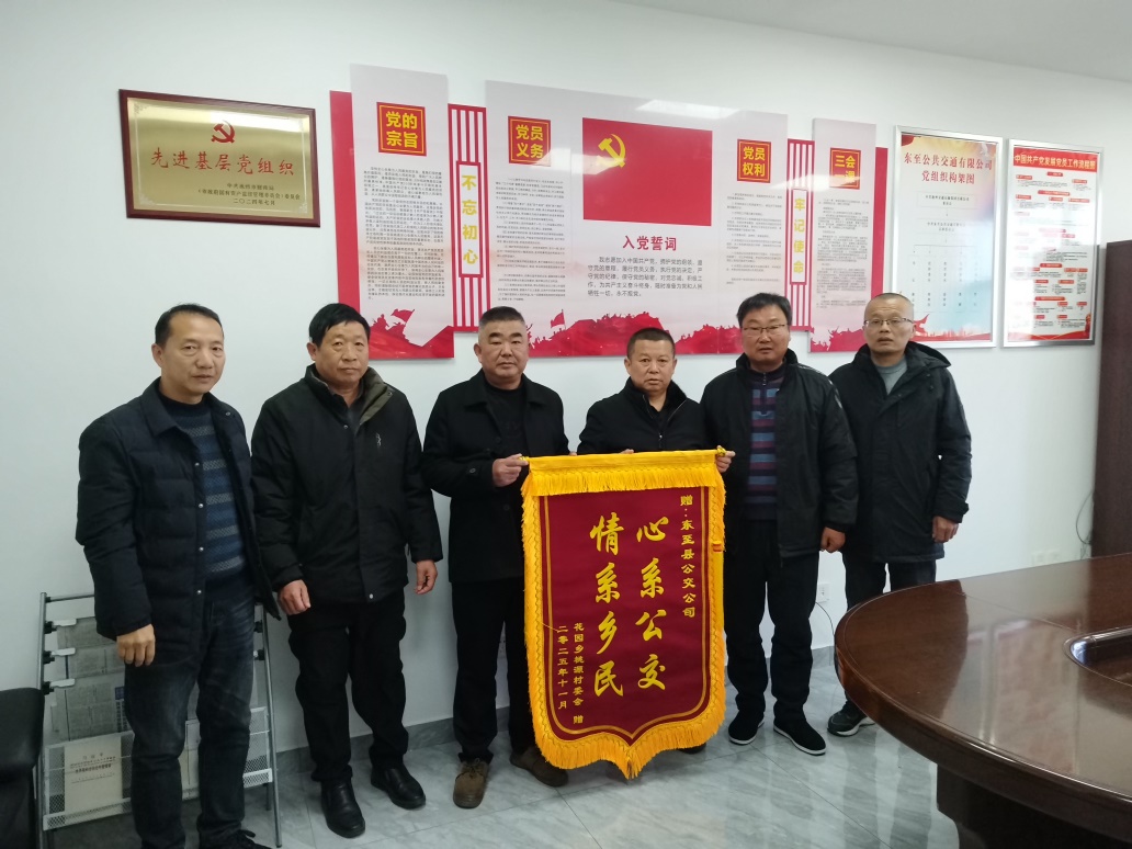 20251125日上午,安徽省池州市東至縣花園鄉桃源村委會支書一行專程來到東至公共交通有限公司,將印有“心系公交 情系鄉民”的錦旗送給公司。感謝公司多年來開行的縣城-桃源村公交車,大大方便了桃源與外界互聯互通,也為沿線人民群眾的出行提供了便利。